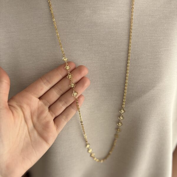 38,00 €Collier sautoir avec perles vertes en plaqué or et perles dorés de 60 cm + la chainette d’extension
