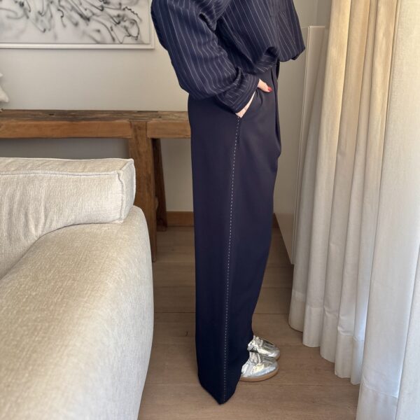 Pantalon fluide bleu marine avec détails ligne blanche sur le côté.