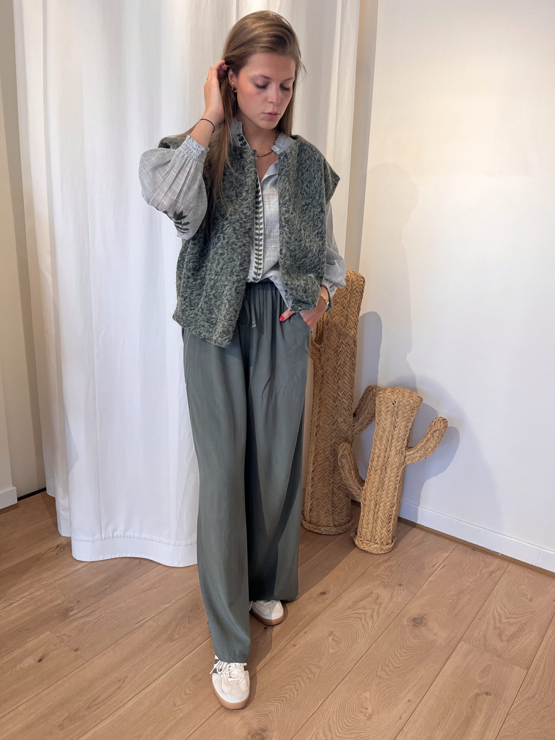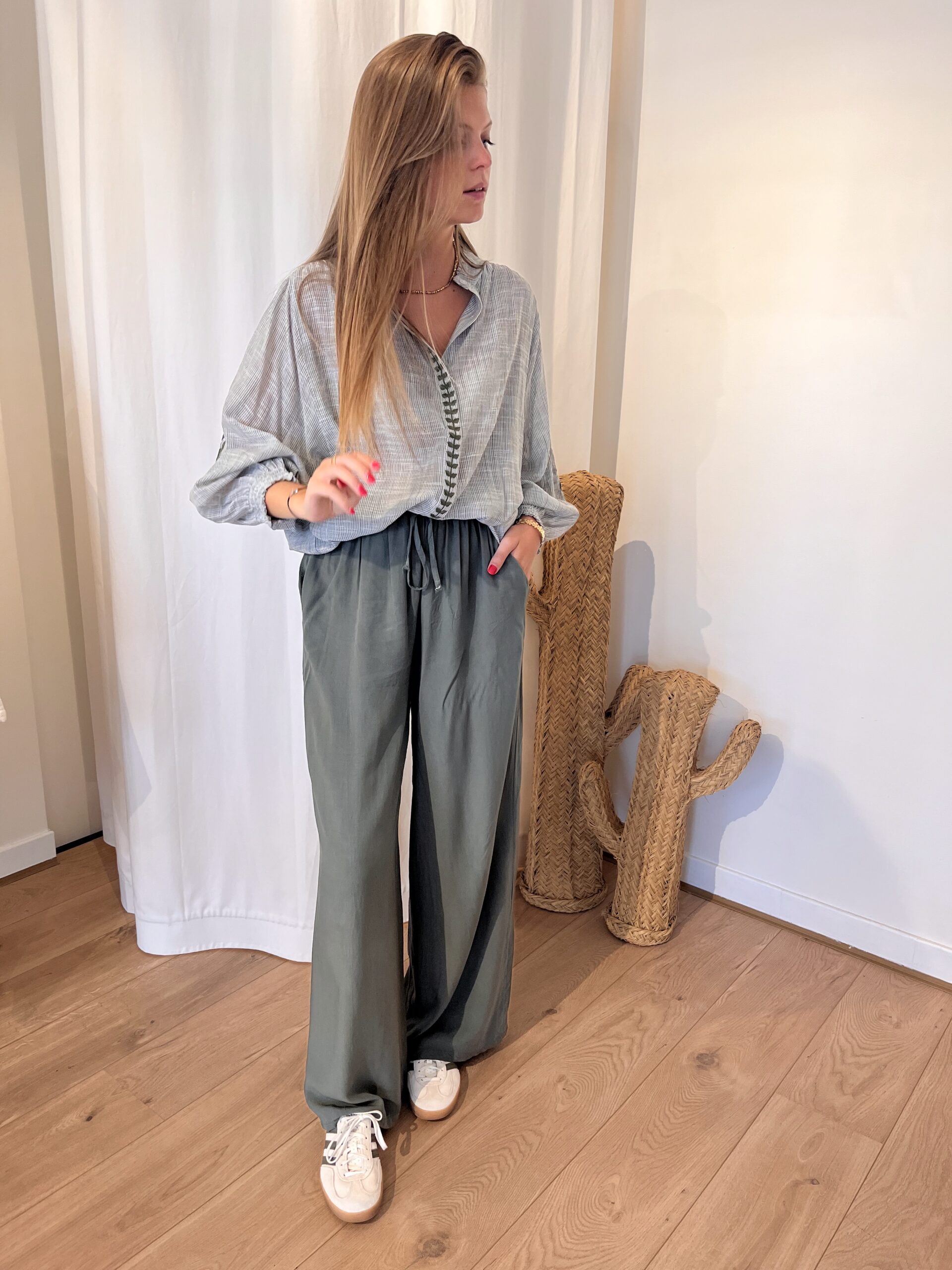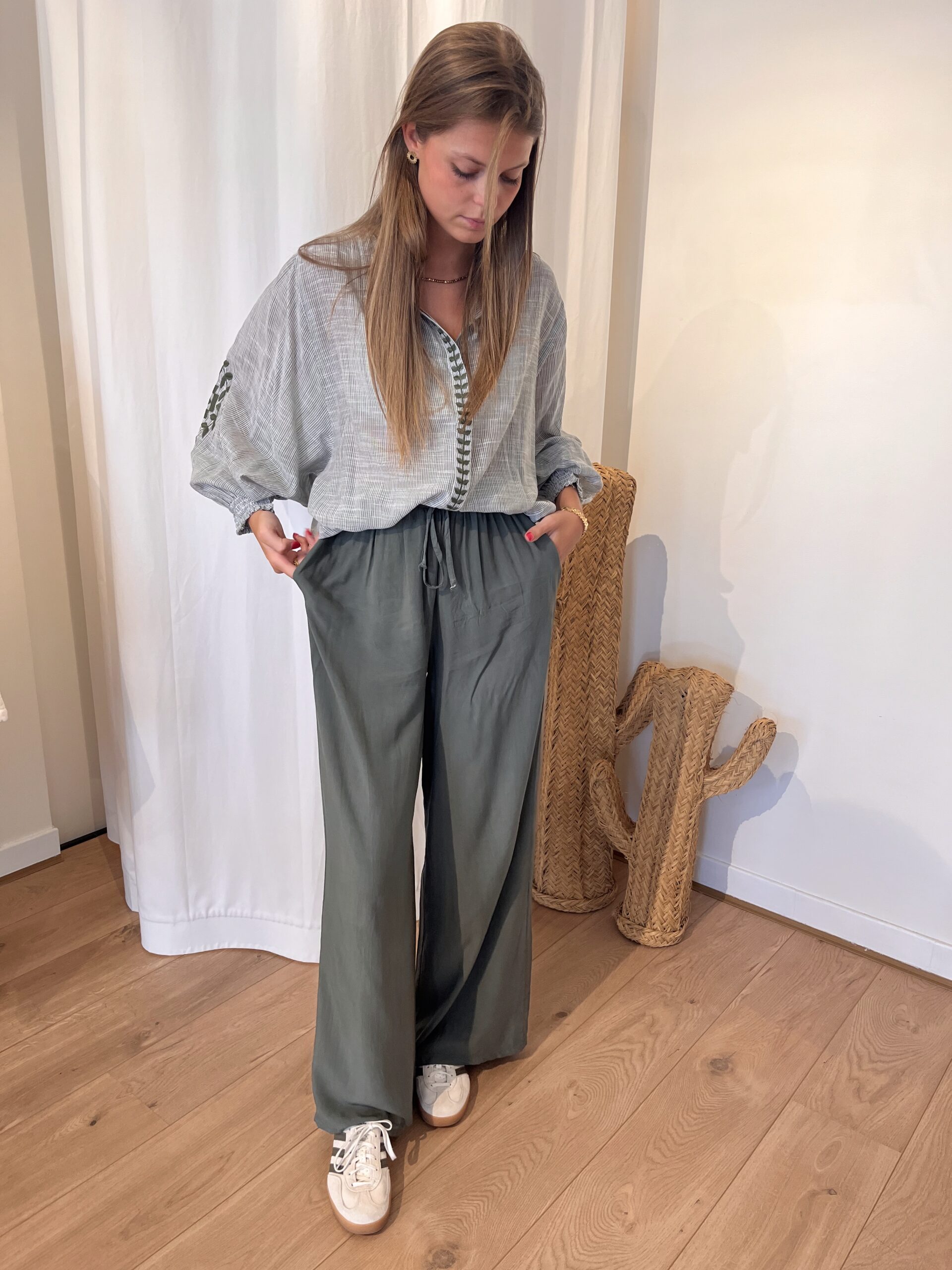Pantalon fluide coloré avec des poches, un bouton et possible de mettre une ceinture