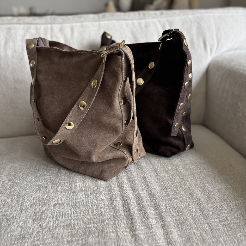 Sac à main de grande taille en daim fabriqué en Italie. Possible d’allonger ou rétrécir la hanse.