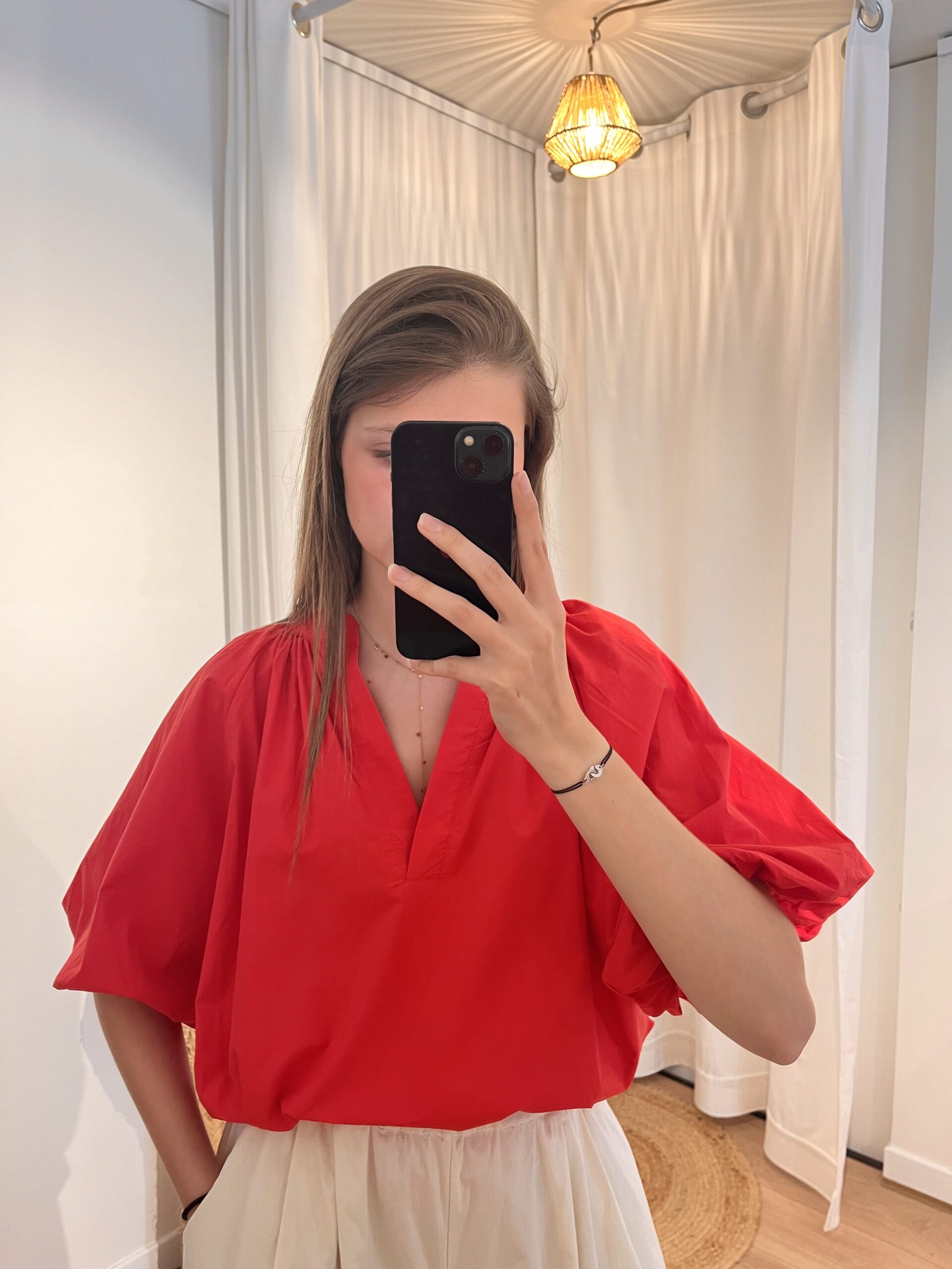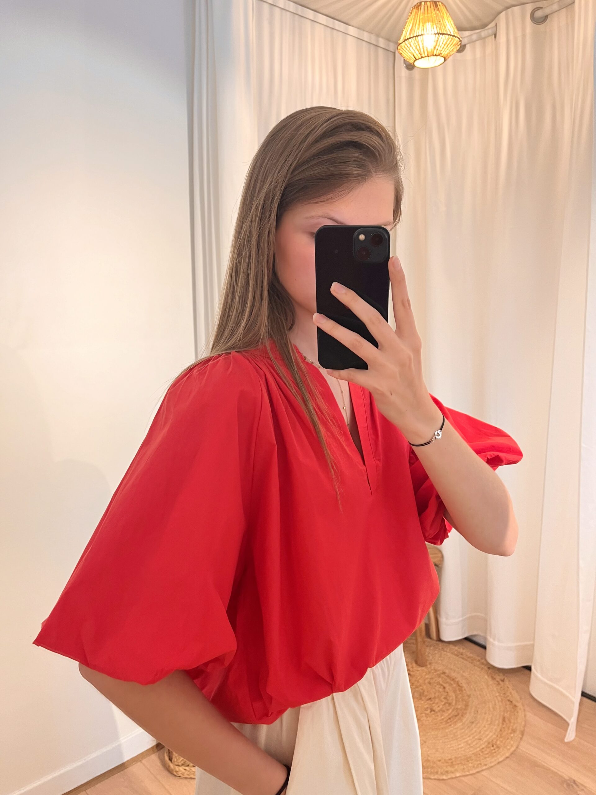 Chemisier rouge, manches bouffantes
