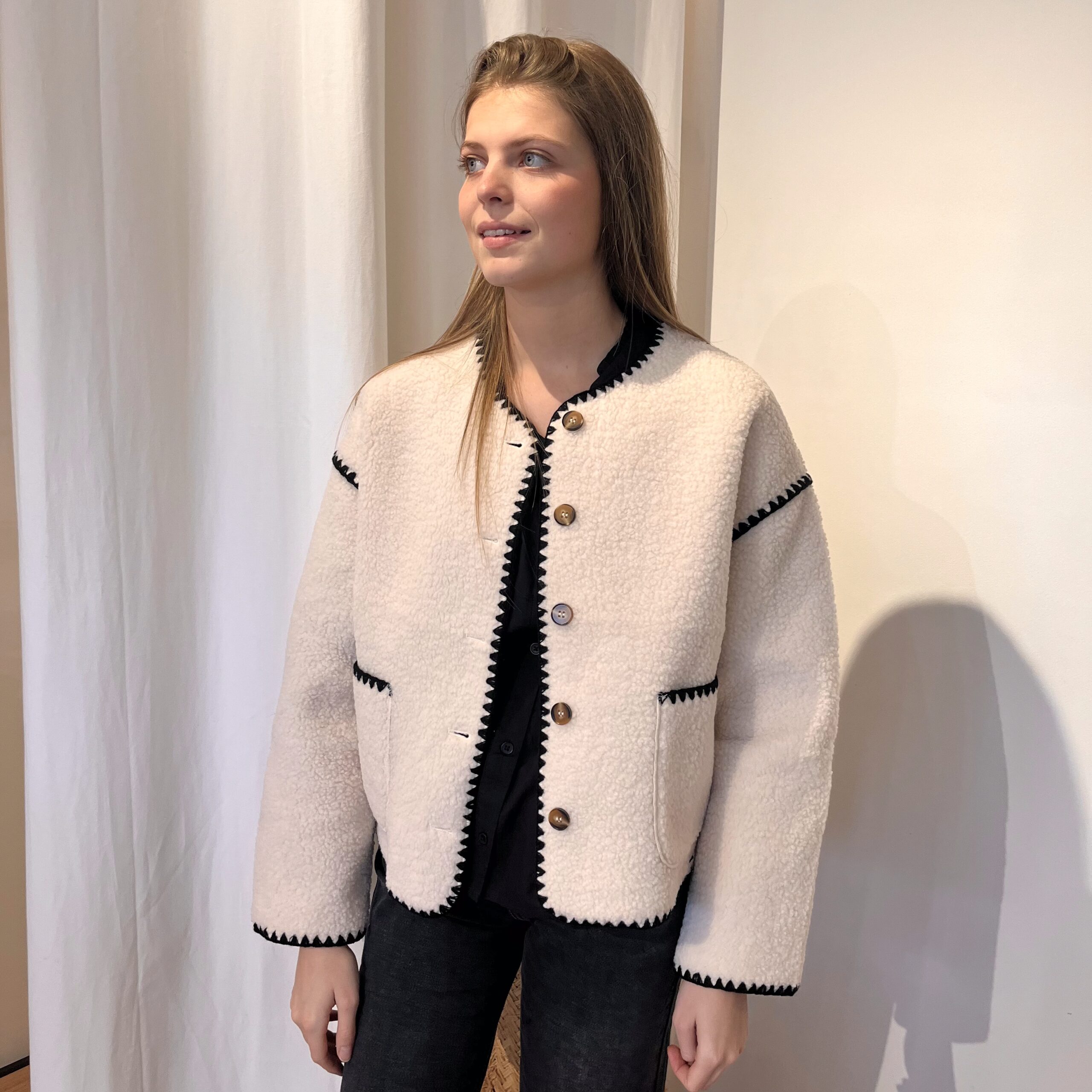 Veste blanche avec détail noir.