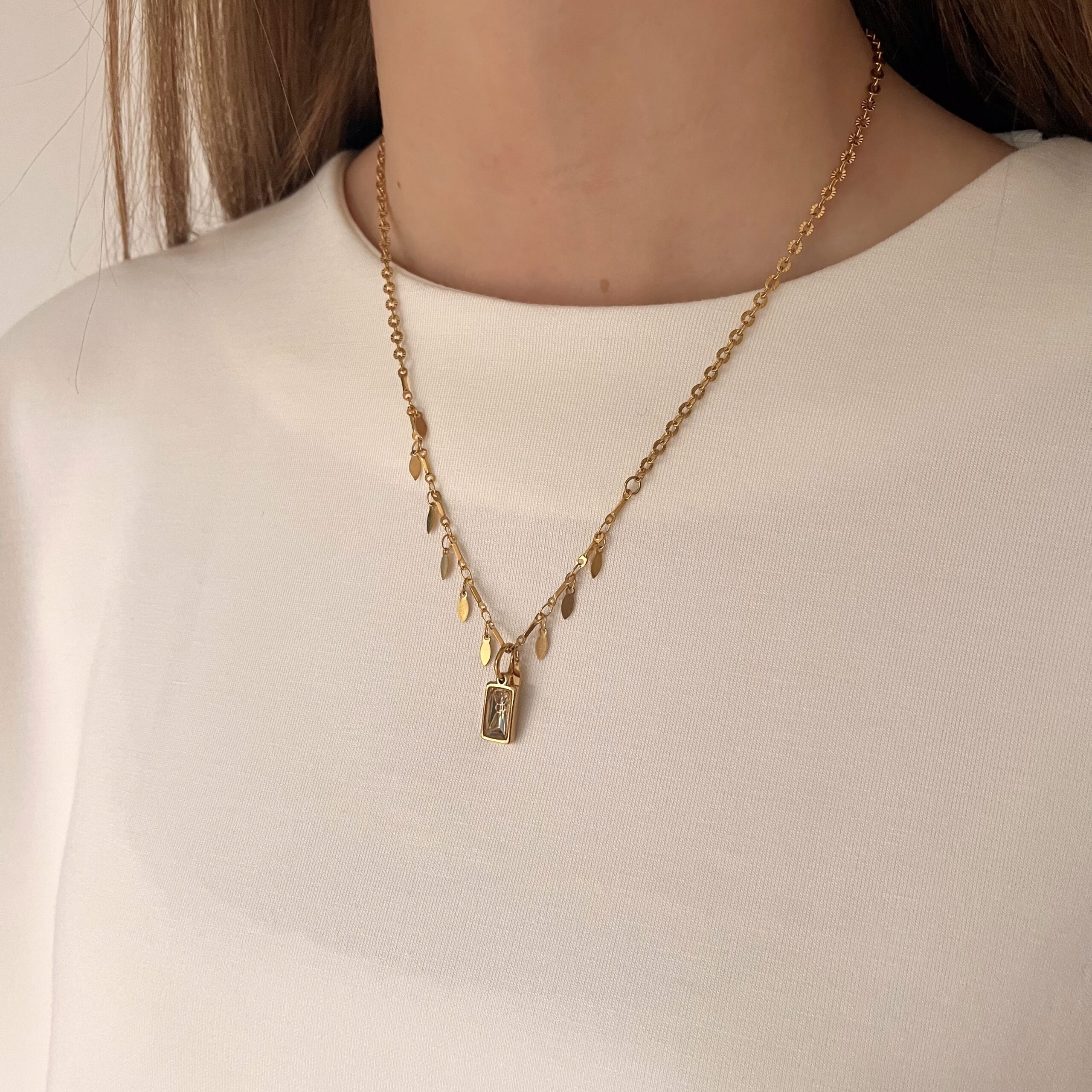 Collier doré fine chaine travaillée, breloque rectangle pierre dorée transparente de 23 à 25 cm