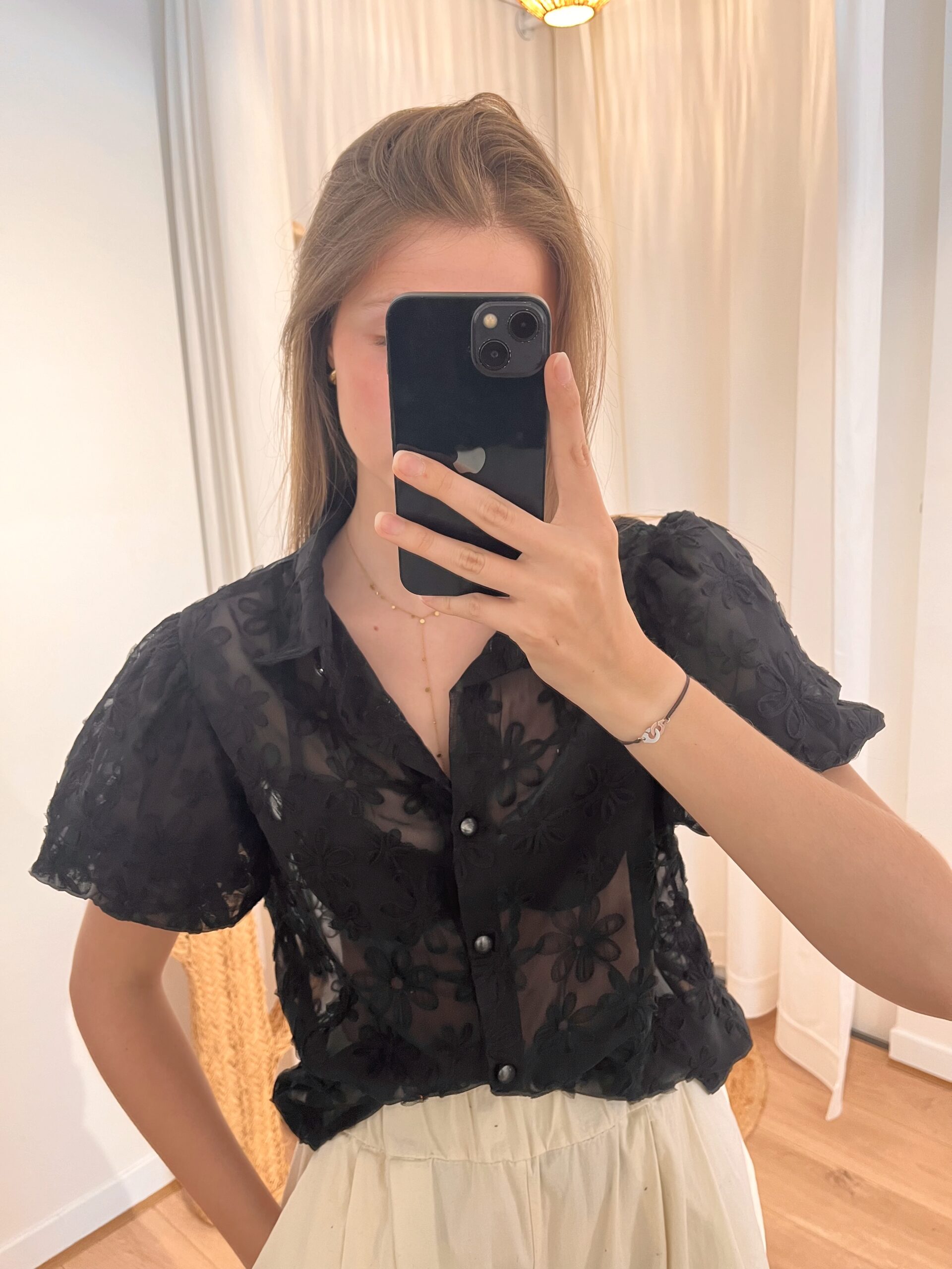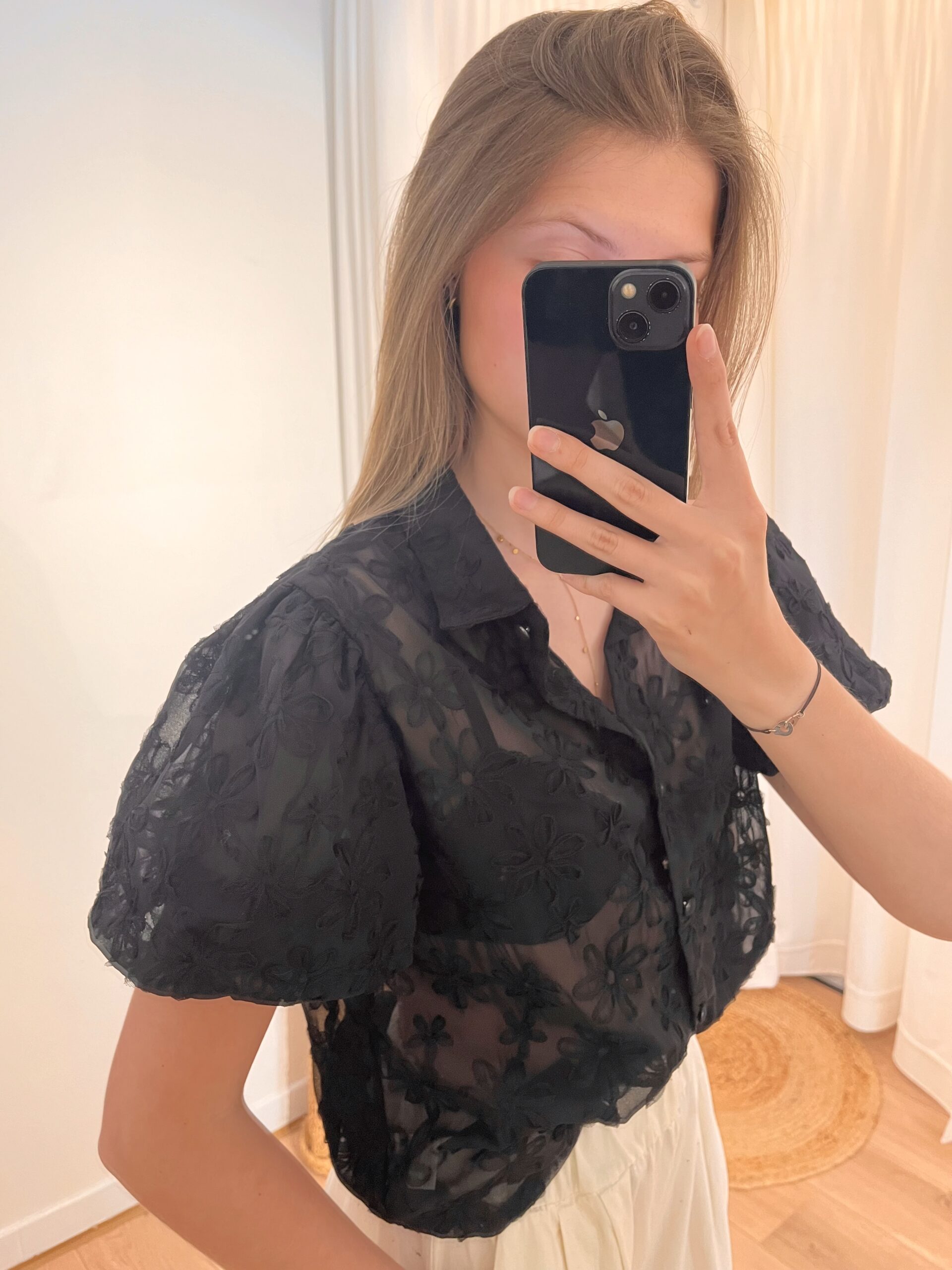 Blouse noire transparente à manches courtes avec fleurs.