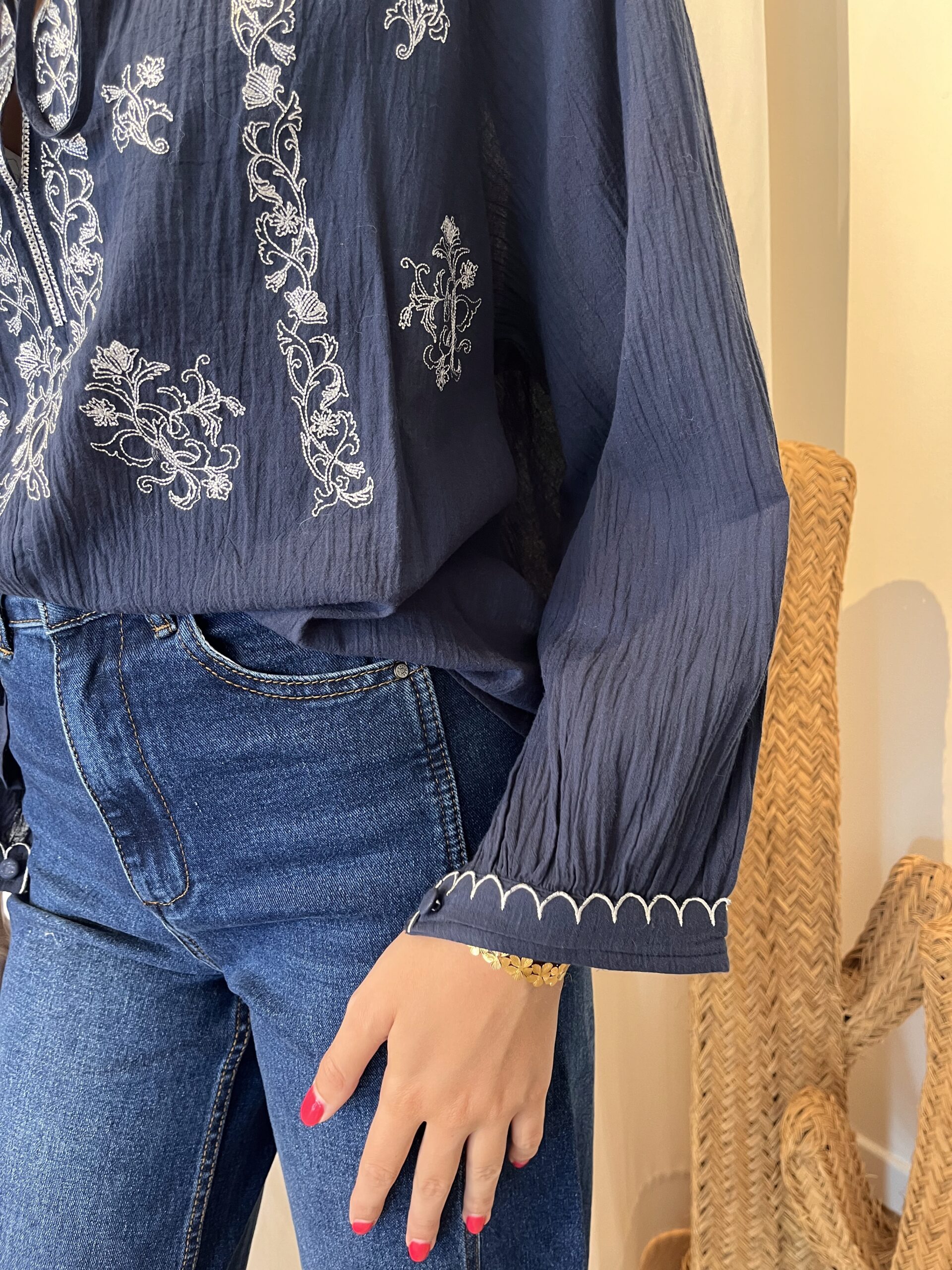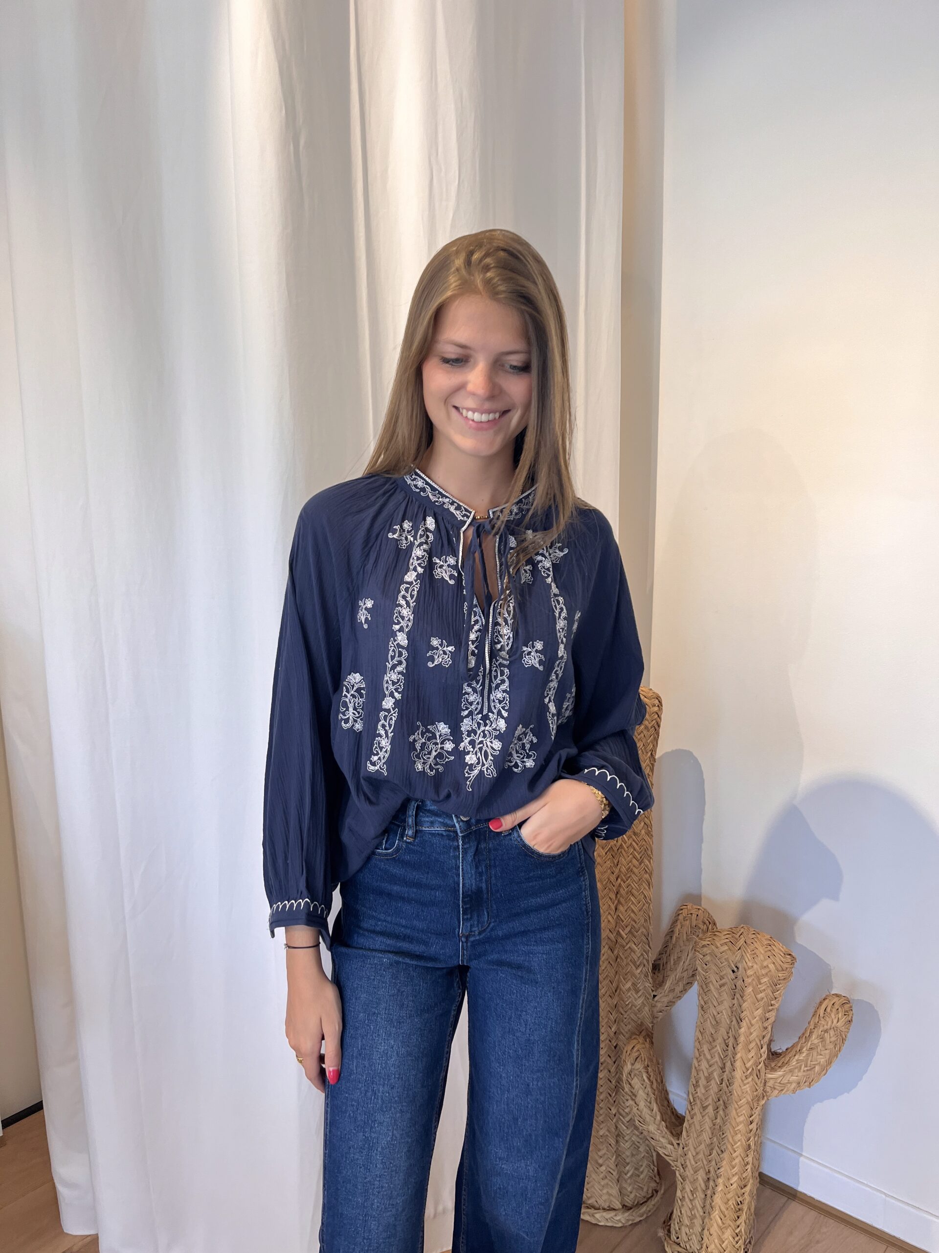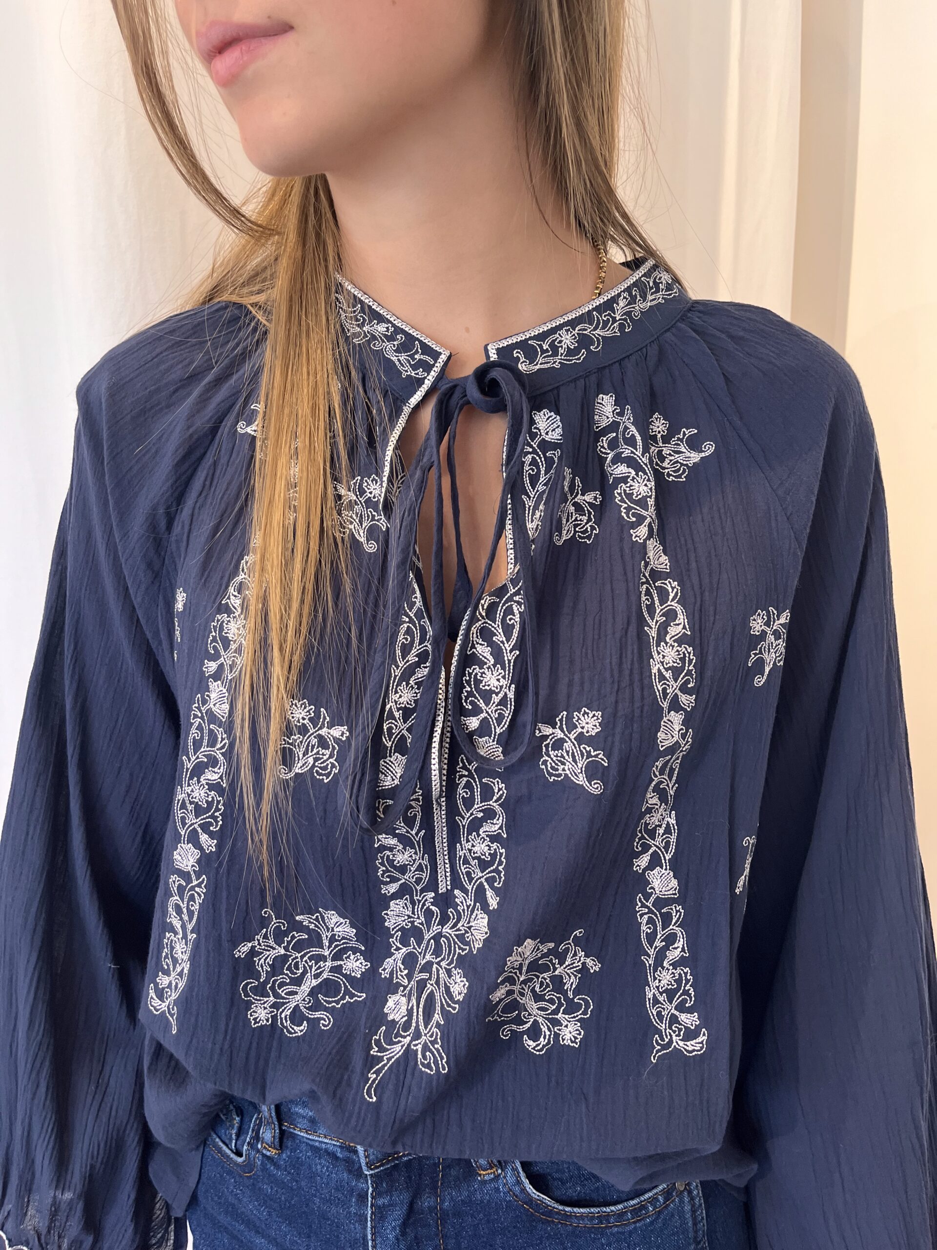 Blouse bleue marine avec broderie.