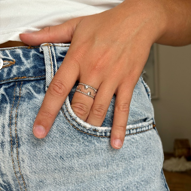 Bague argentée réglable en acier inoxydable.