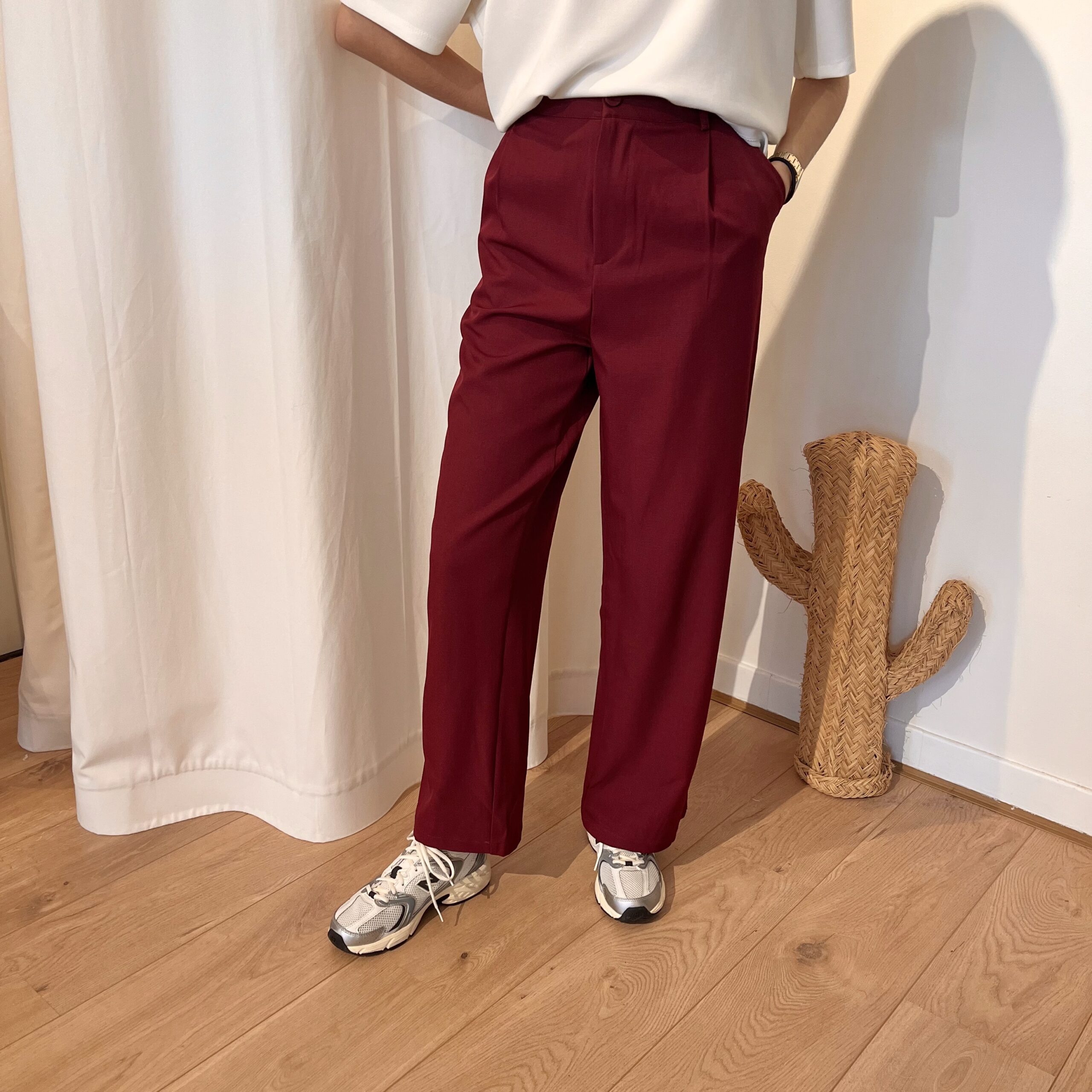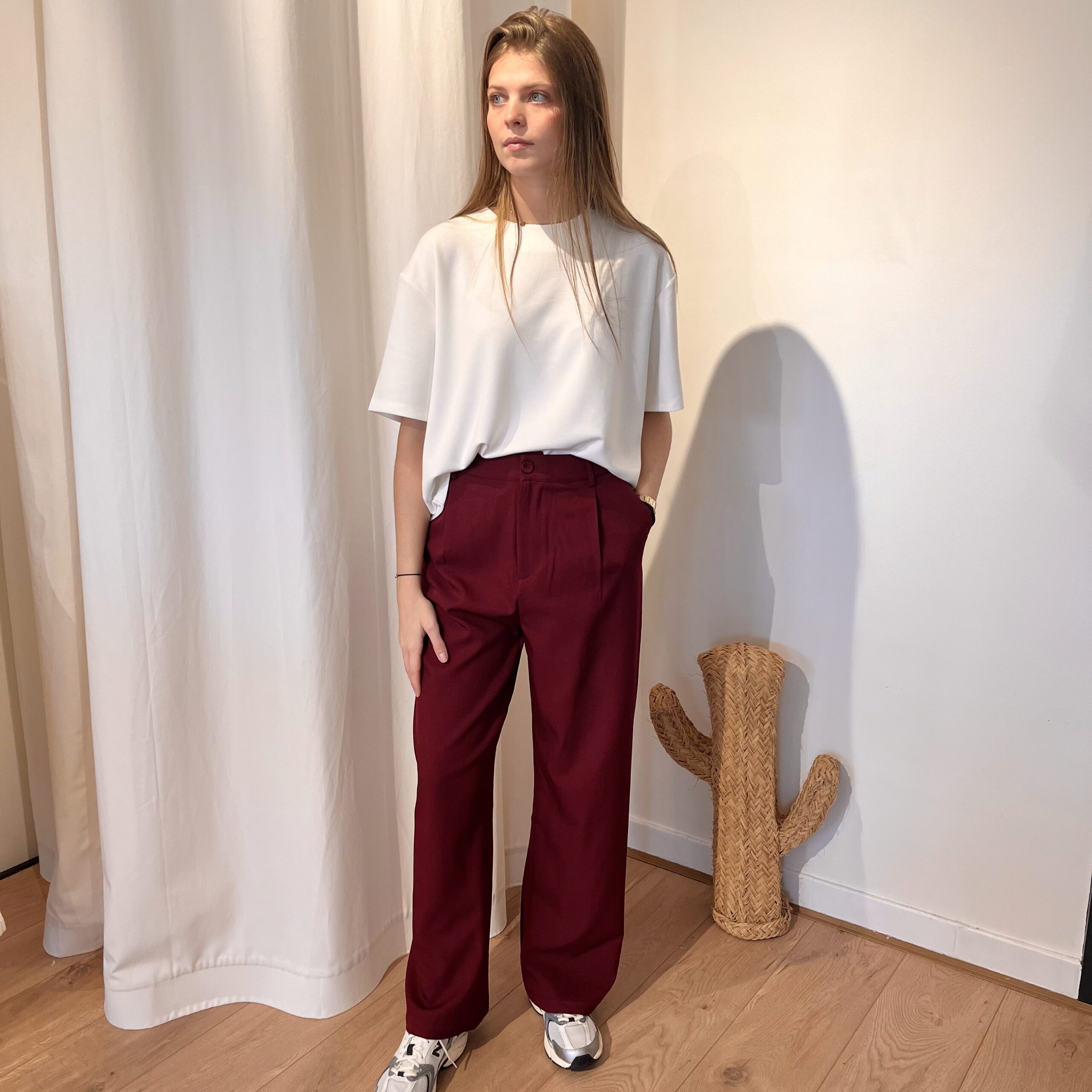 Pantalon bordeaux.
