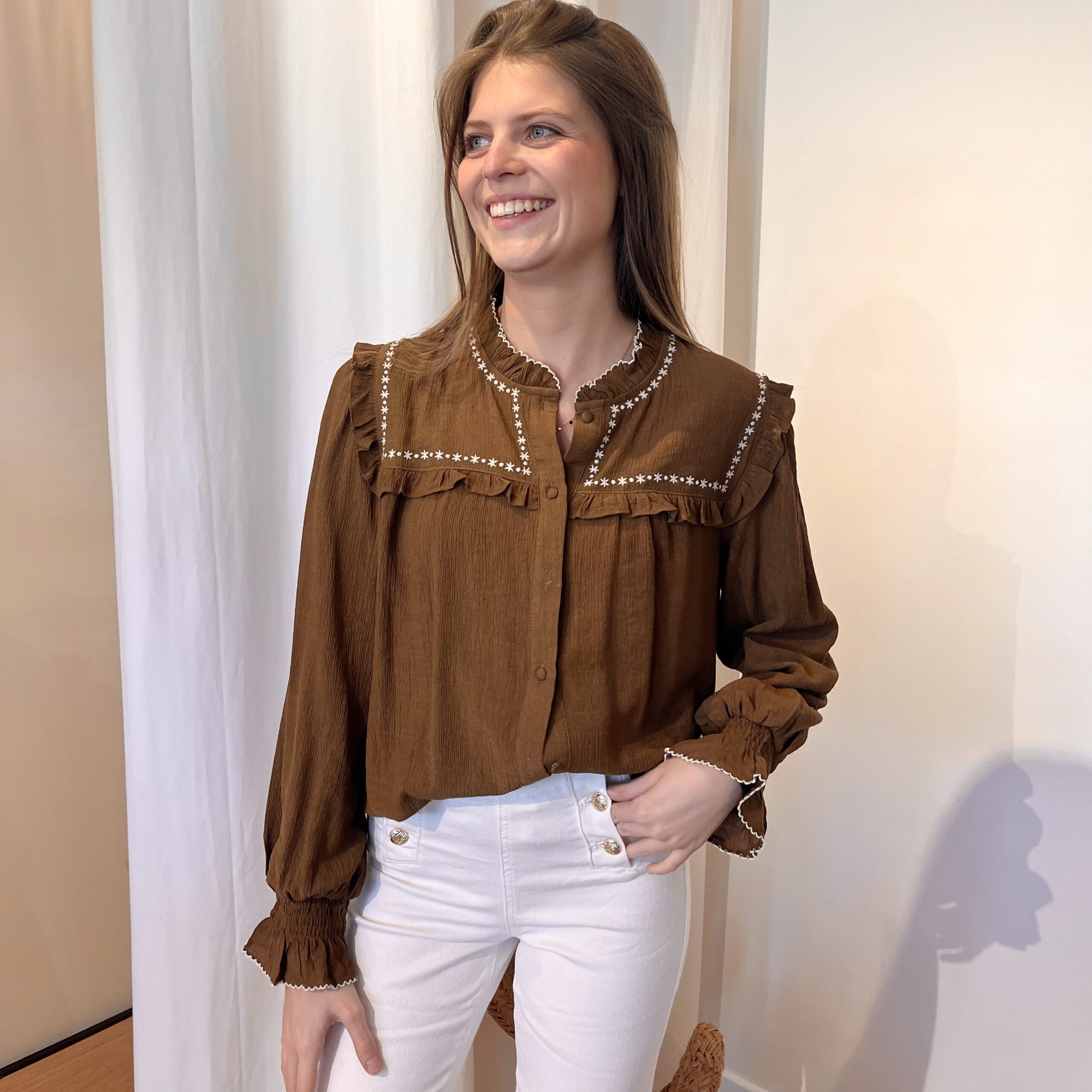 Blouse marron avec détails en dentelle.