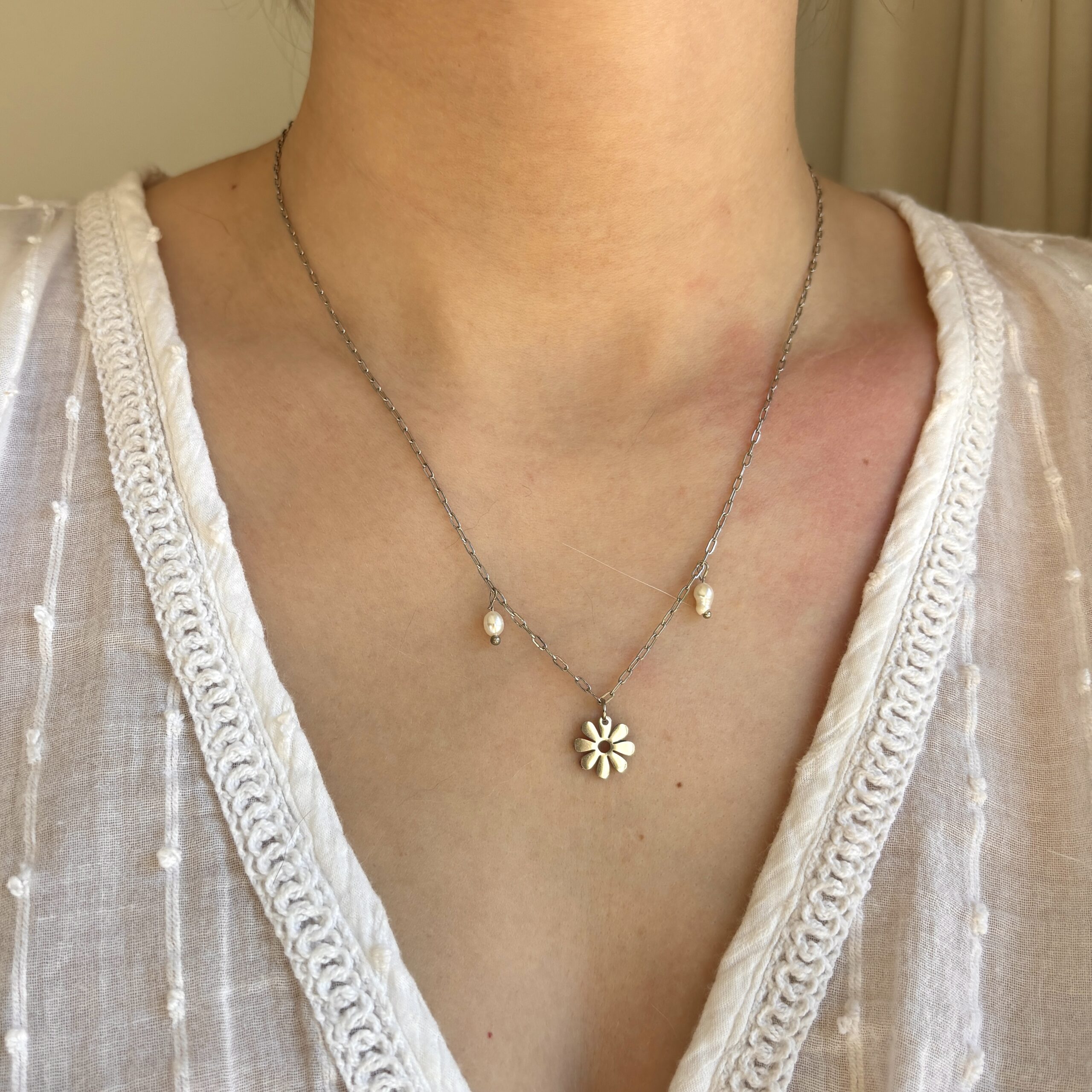 Collier argenté en acier inoxydable avec perles d’eau douce de 45 cm + la chainette d’extension