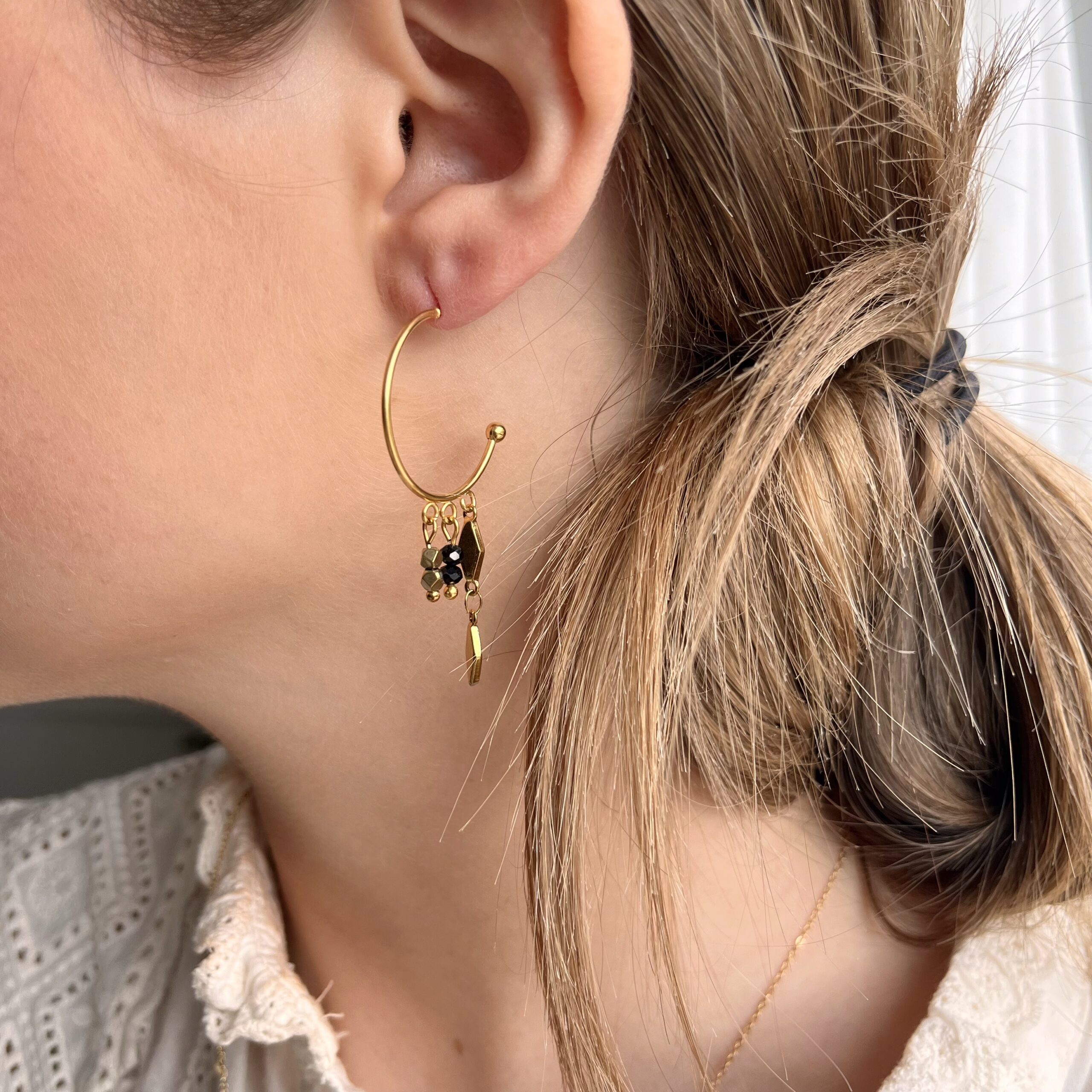 Boucles d’oreilles créoles doré avec perles noires en acier inoxydable