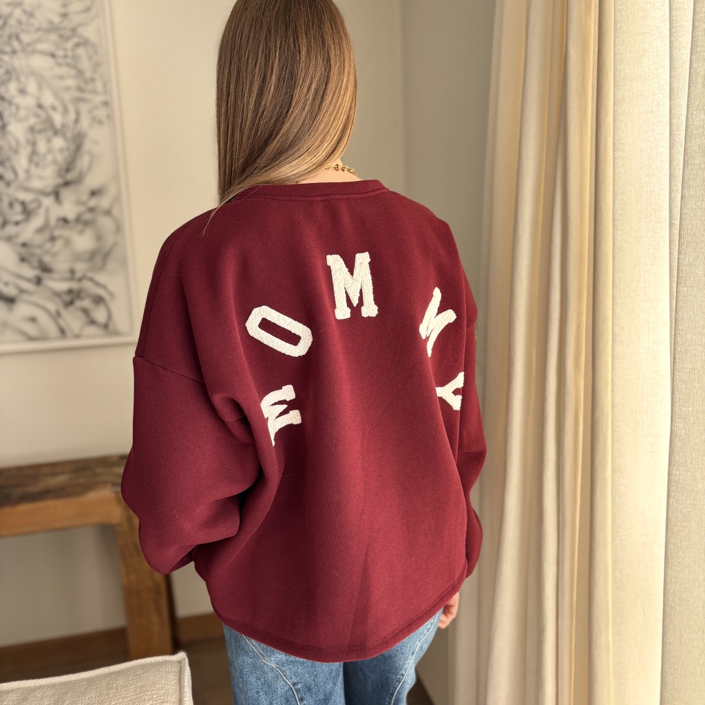 Pull tout doux bordeaux avec écriture en moumoute