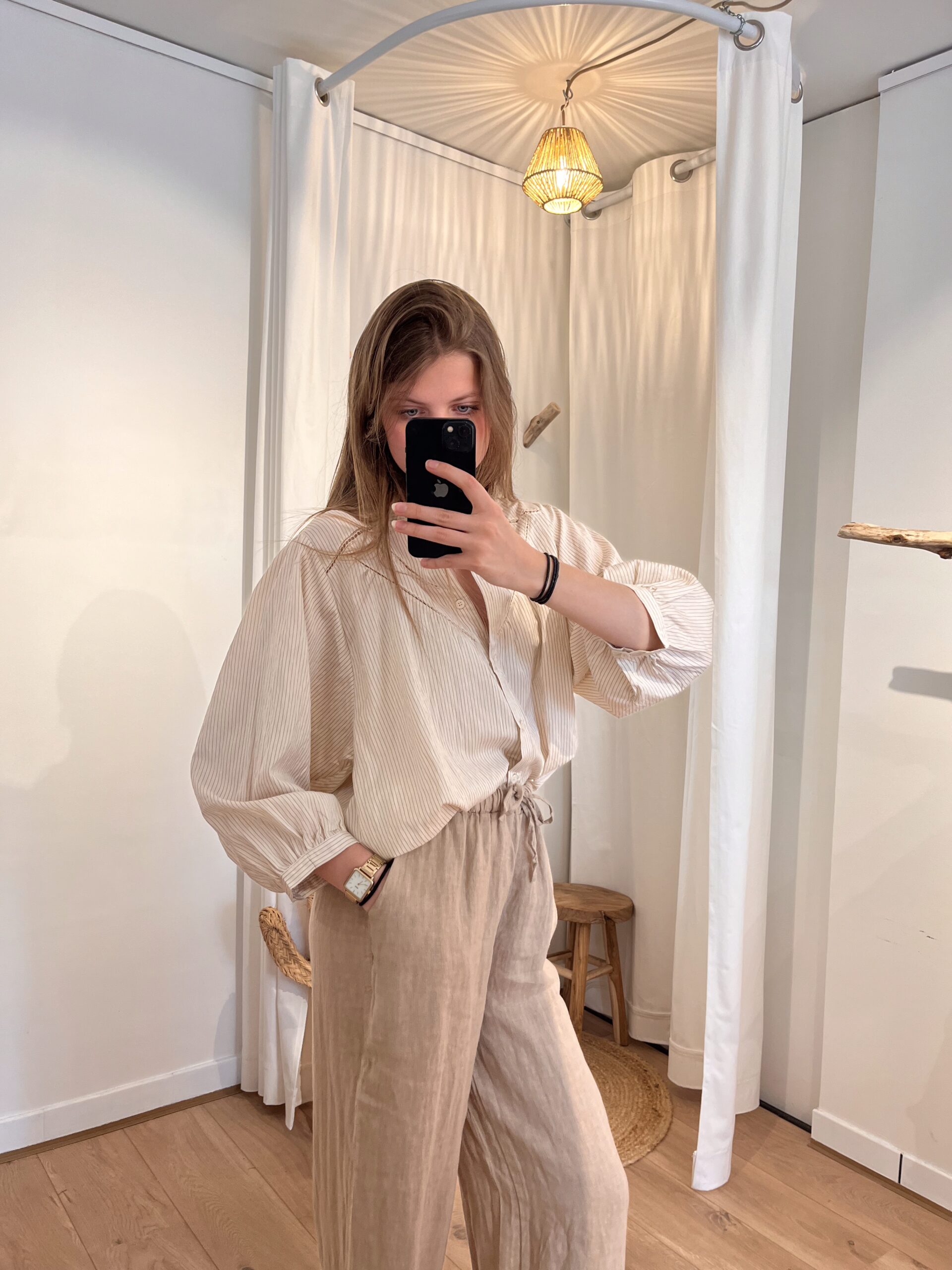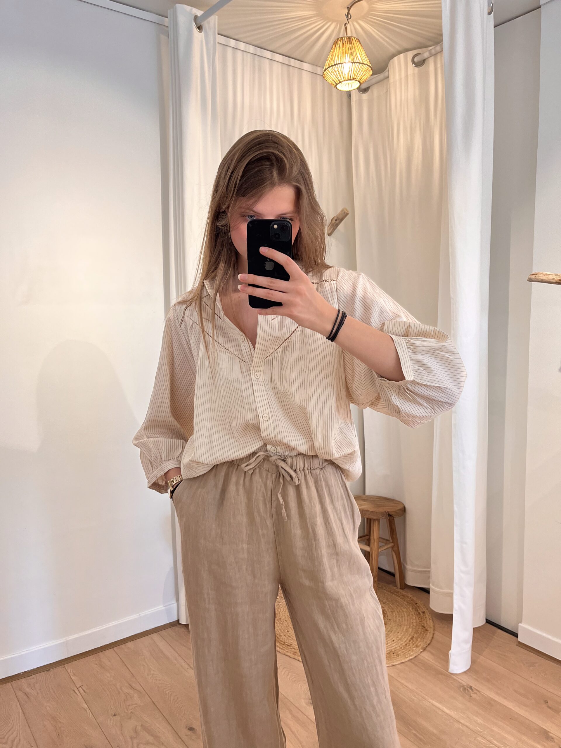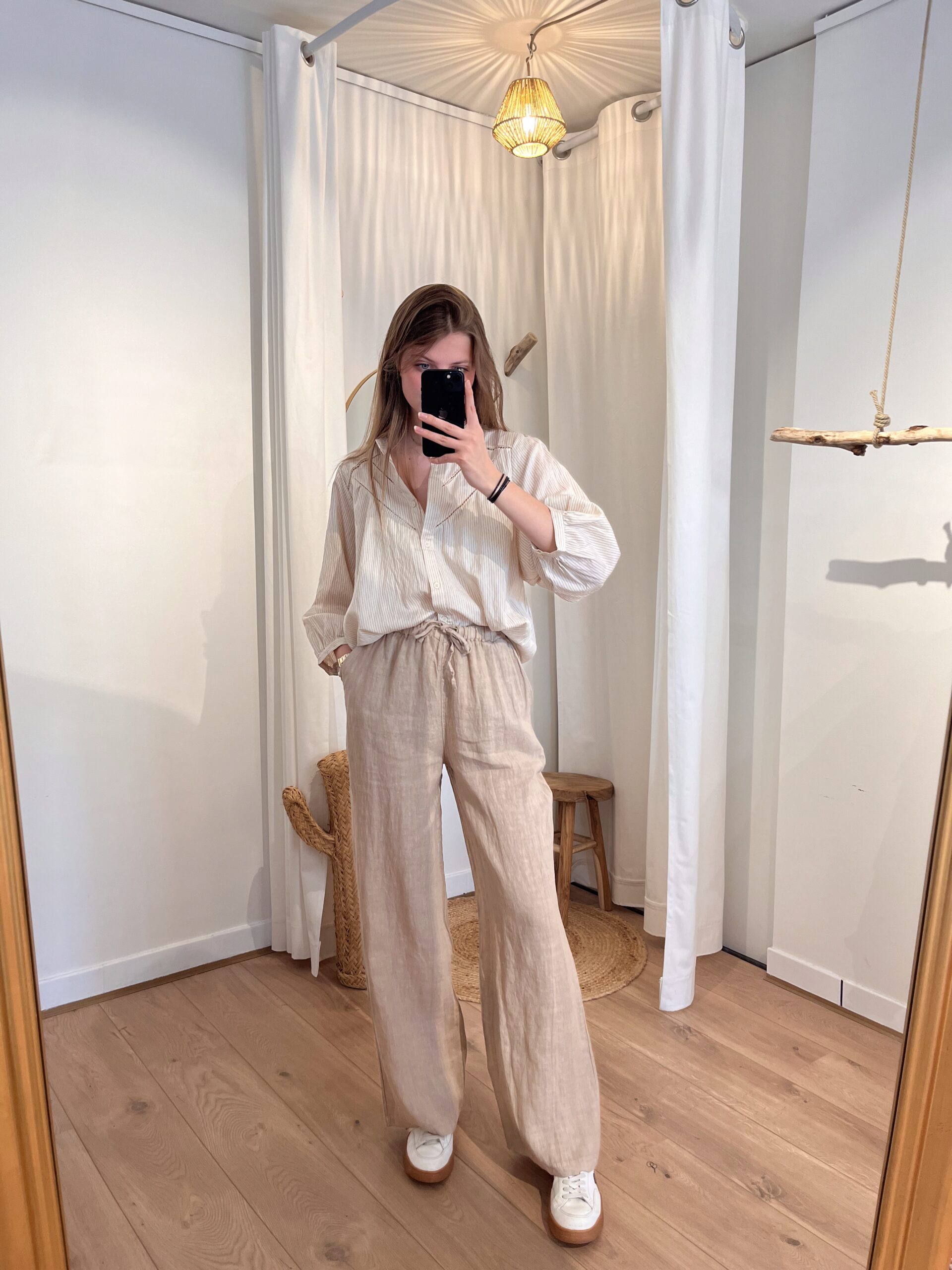 Pantalon en lin de couleur beige.