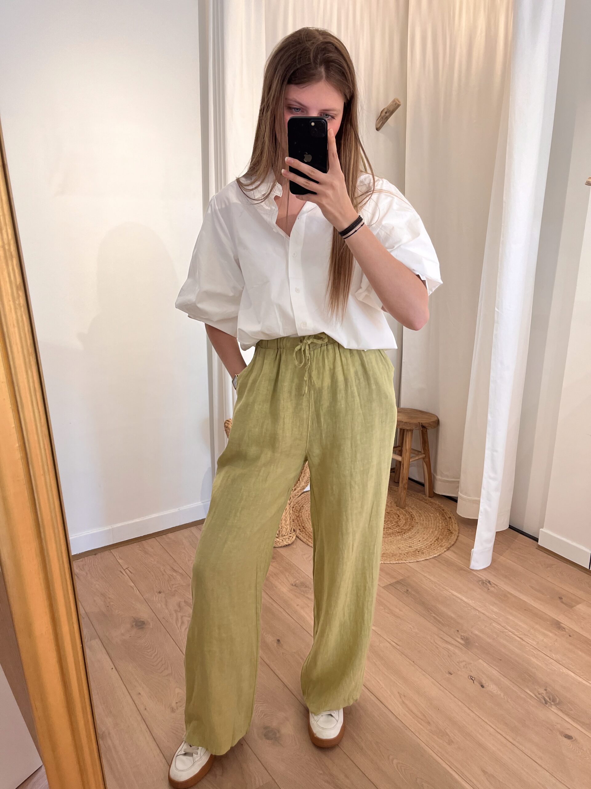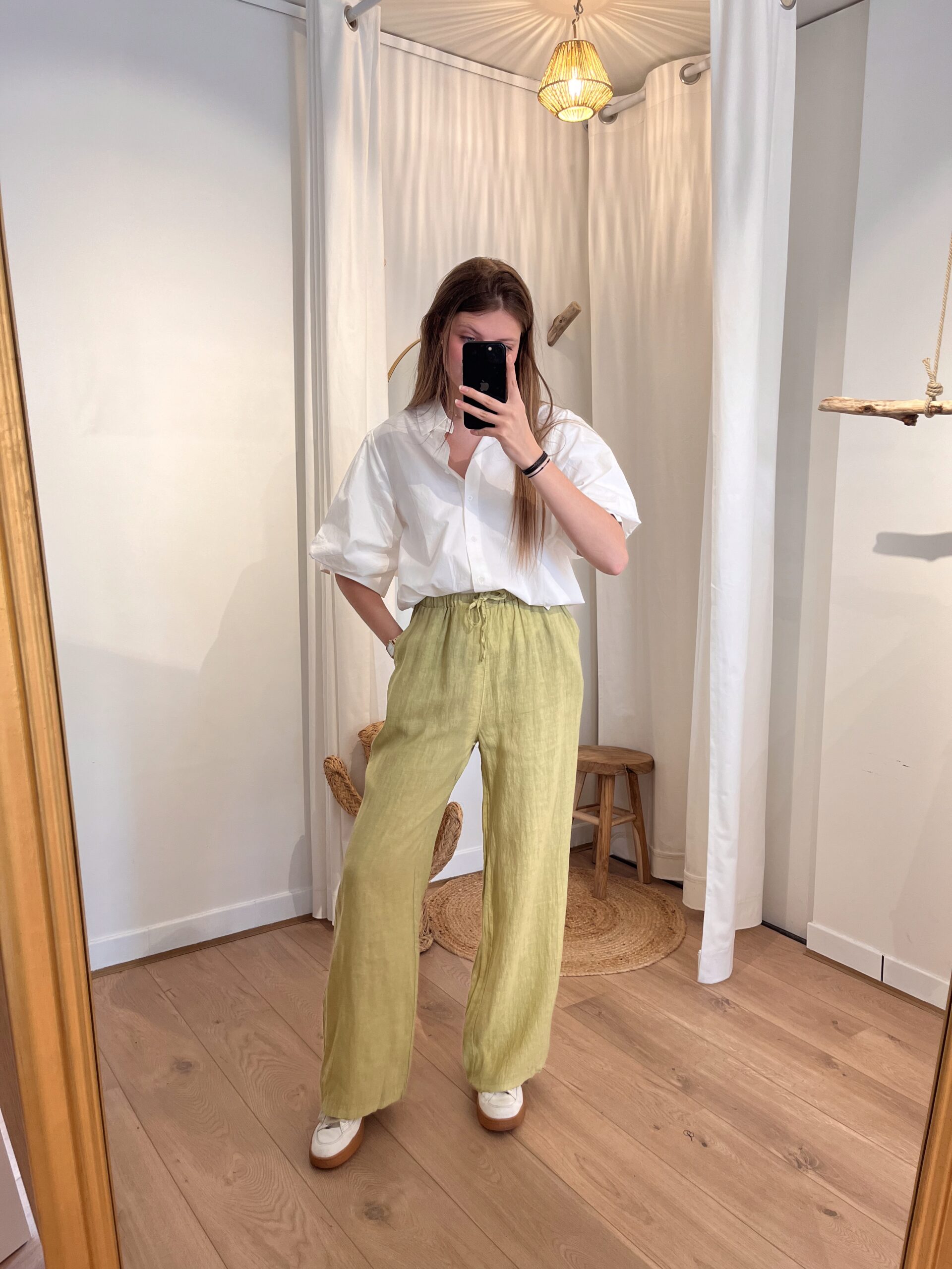 Pantalon fluide coloré avec des poches, un bouton et possible de mettre une ceinture