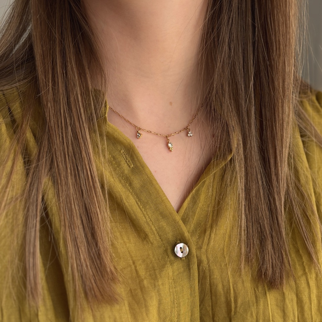 35,00 €Collier doré avec pierres naturelles vertes, bleues, dorées en acier inoxydable de 60 cm + la chainette d’extension