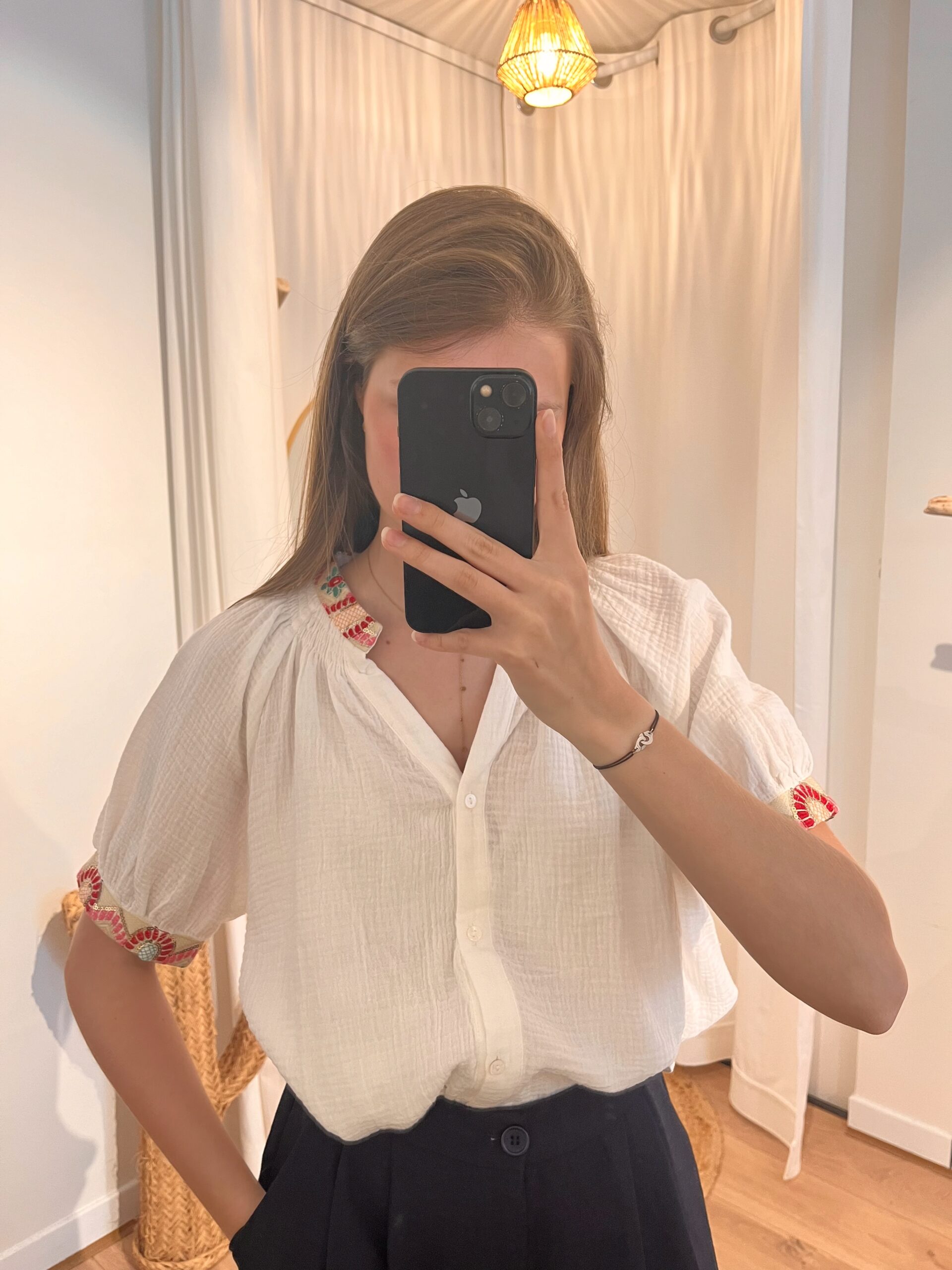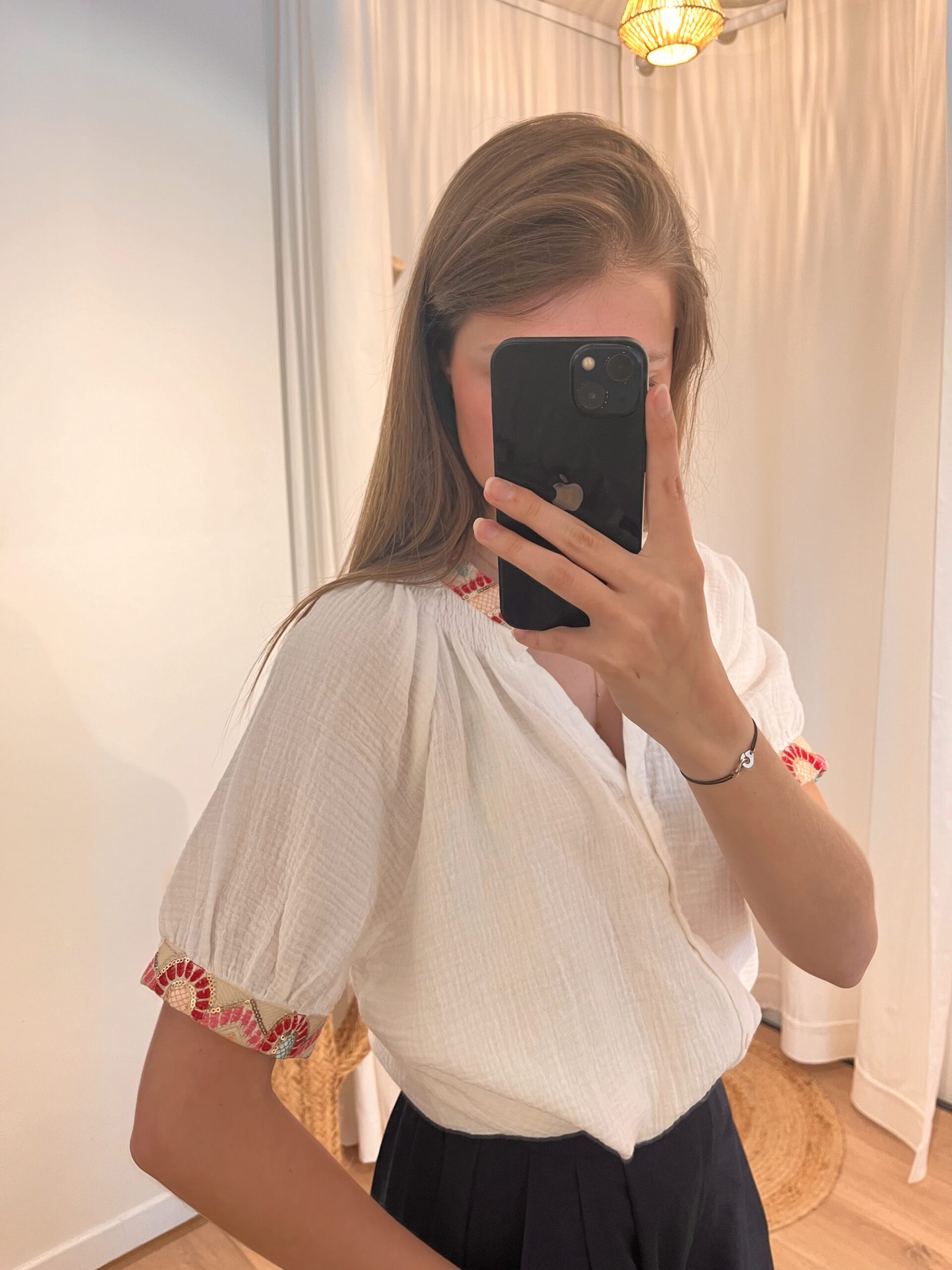Chemisier blanc en gaze de coton, manches courtes et bord de manche coloré.