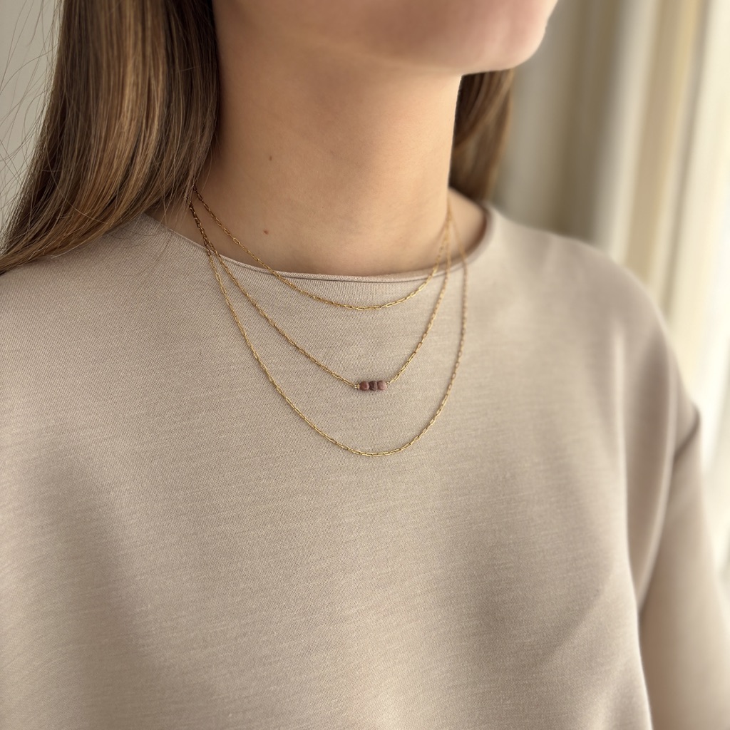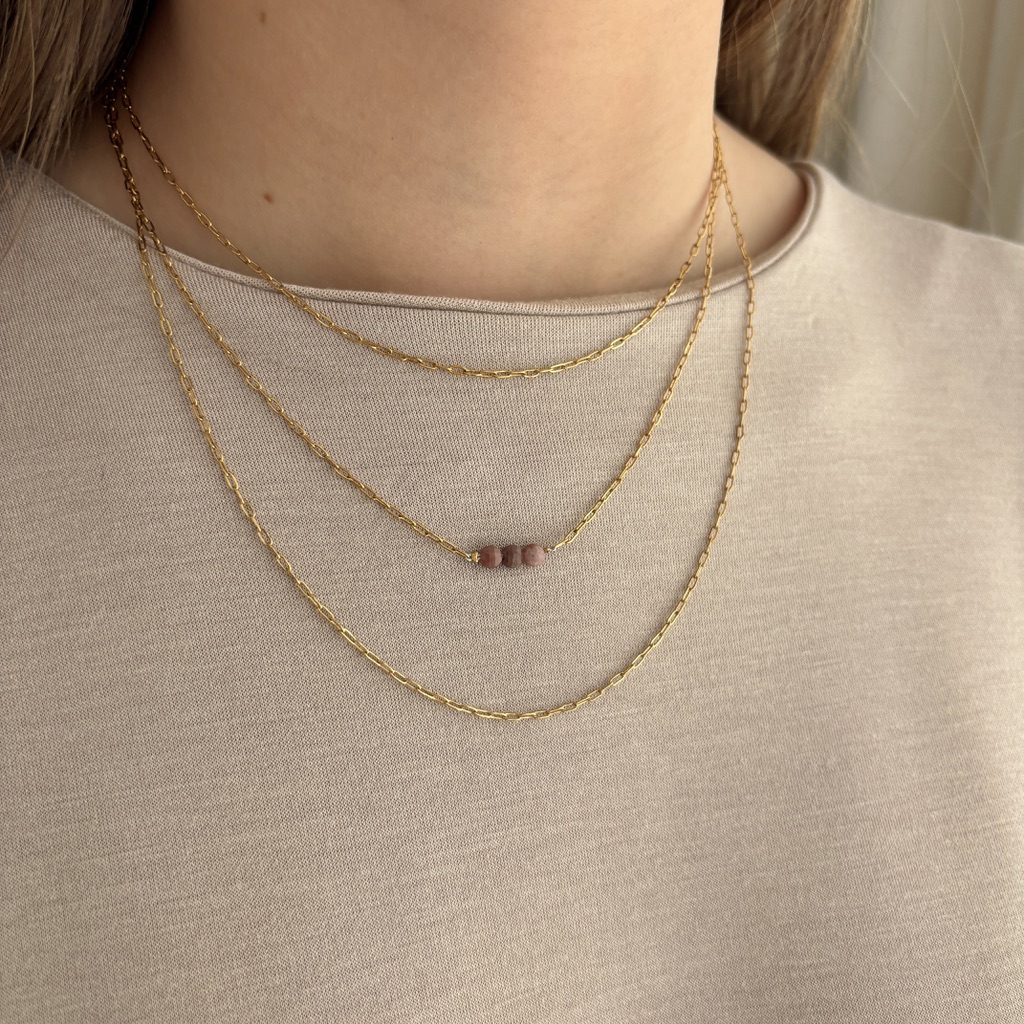 Collier triple doré en acier inoxydable avec 3 pierres rose naturelles de 30 cm + la chainette d’extension