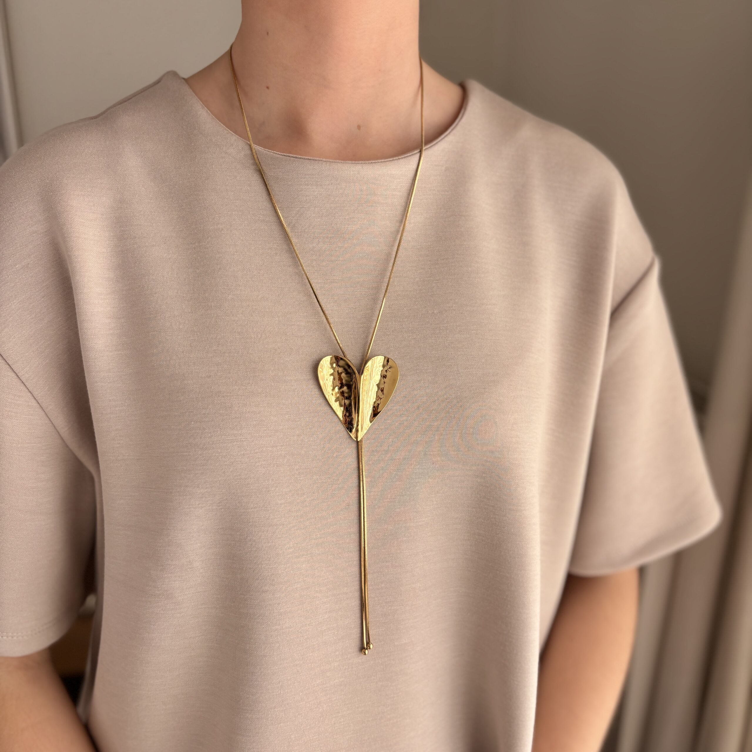 Collier doré en acier inoxydable de +- 60 cm réglable au niveau du cœur. Le cœur se glisse sur la chaine pour le rendre plus long ou plus court.